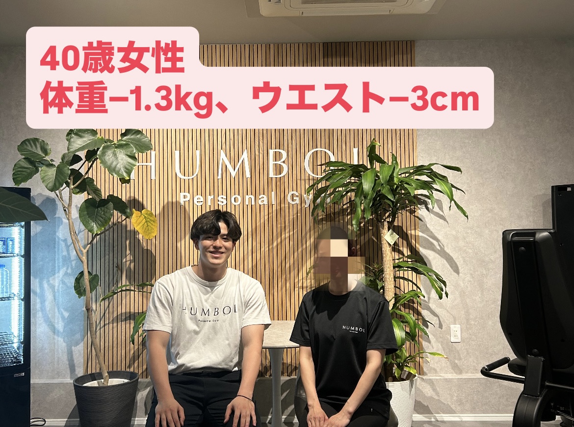 「某ダイエットジムに通い、リバウンドをしてを数 回繰り返し、現在HUMBOLさんにお世話になっ ております。こちらでは、食べて痩せる食事改善 とトレーナーさんの前向きな関わりで開始3ヶ 月時点で-6kgに成功しています。トレーニング は楽しく、肩こり改善や姿勢改善のストレッチ もしてくれるので身体のことはトータルしてお任せしています。」