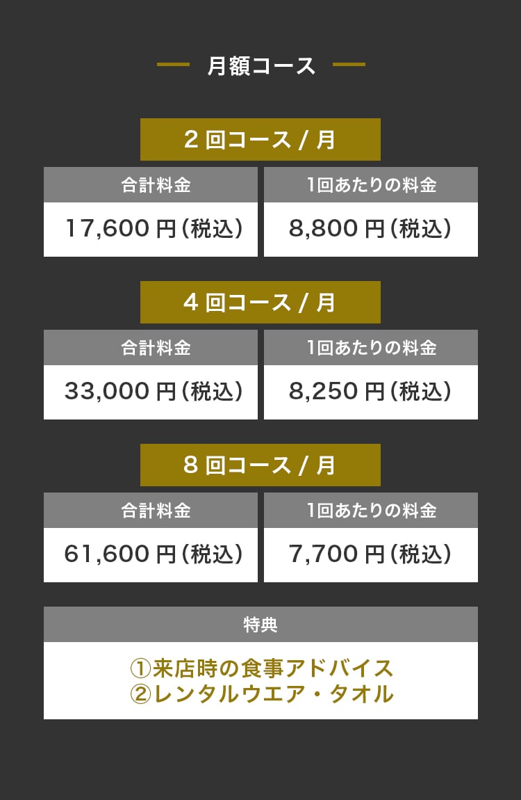 | 8回コース/月 | 61,600円 | 7,700円 |