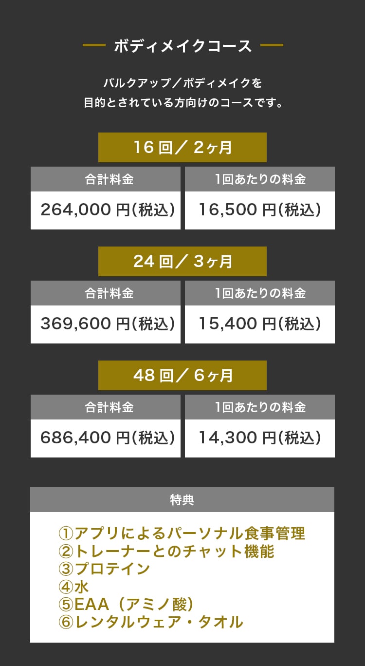 バルクアップ/ボディメイクを目的とされている方向けのコースです。